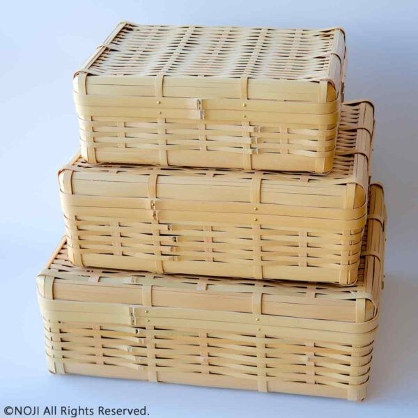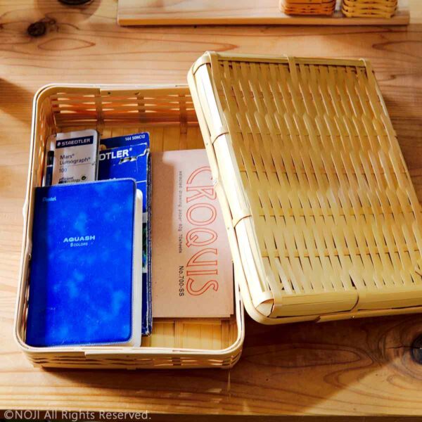 また、夫々の面を別々に編んだ後に組み合わせ、真鍮釘で留めるという、至ってシンプルな竹細工であり、精緻なものに比べ、頑丈な造りとなっている。